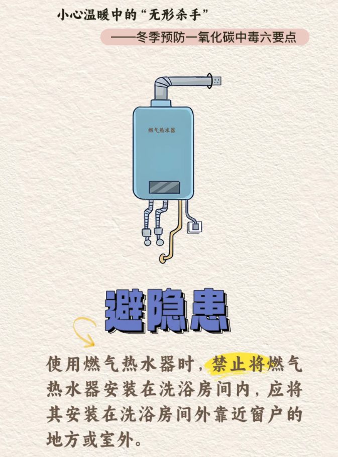 使用燃气热水器洗澡注意通风,谨防一氧化碳中毒。