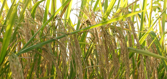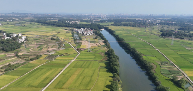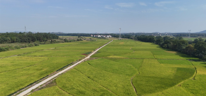 在寿雁镇高枧村万亩粮食示范片,从空中俯瞰,连片的稻田形成了迷人的“稻海”,金黄的稻田与青山、小路、村庄相映成趣,勾勒出一幅丰收的喜人画卷。微风拂过,金黄色的稻穗随风飘舞,掀起层层稻浪,美不胜收。