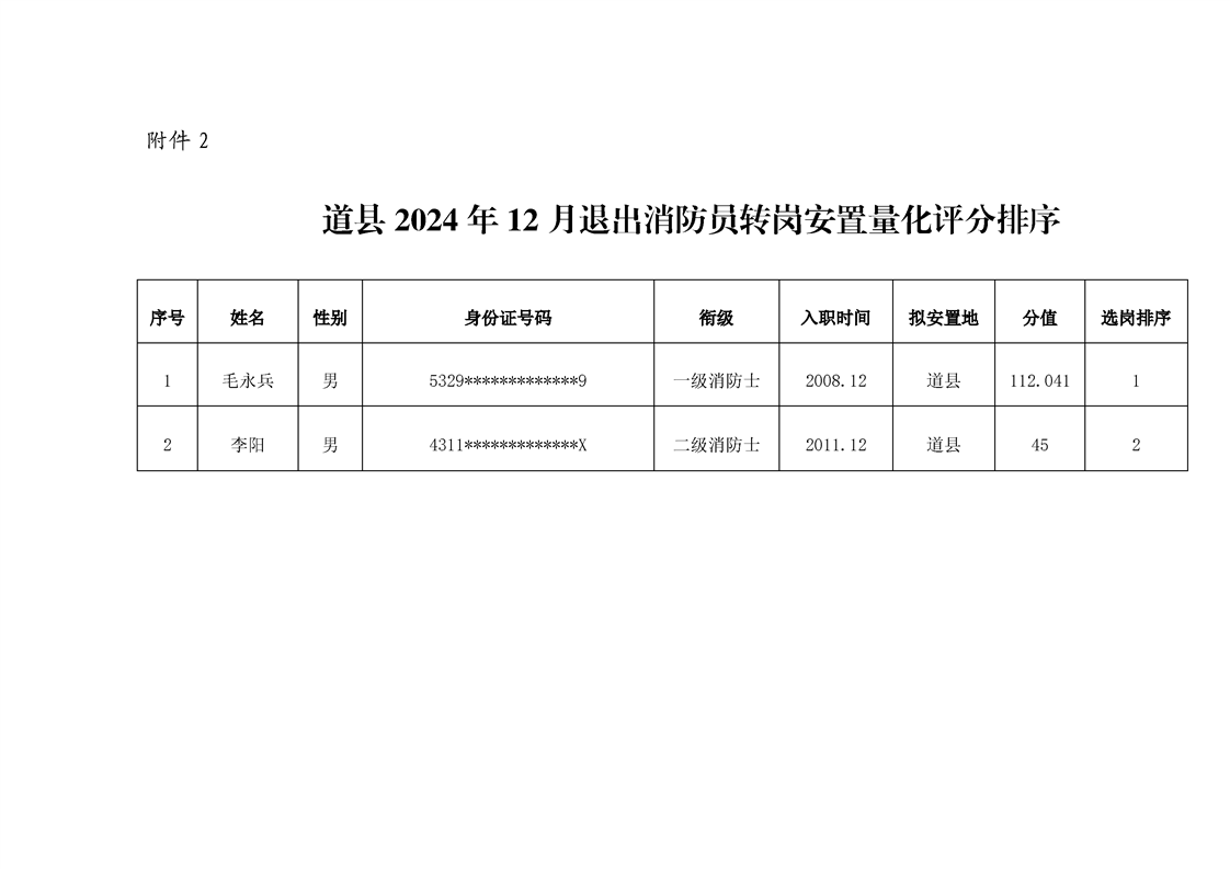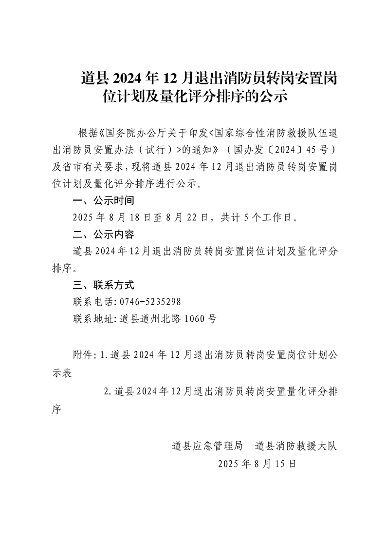 做爱视频2024年12月退出消防员转岗安置岗位计划及量化评分排序的公示