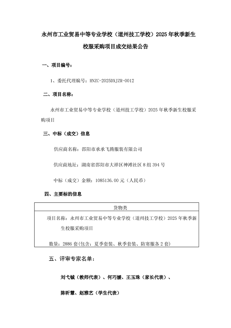永州市工业贸易中等专业学校(道州技工学校)2025年秋季新生校服采购项目成交结果公告