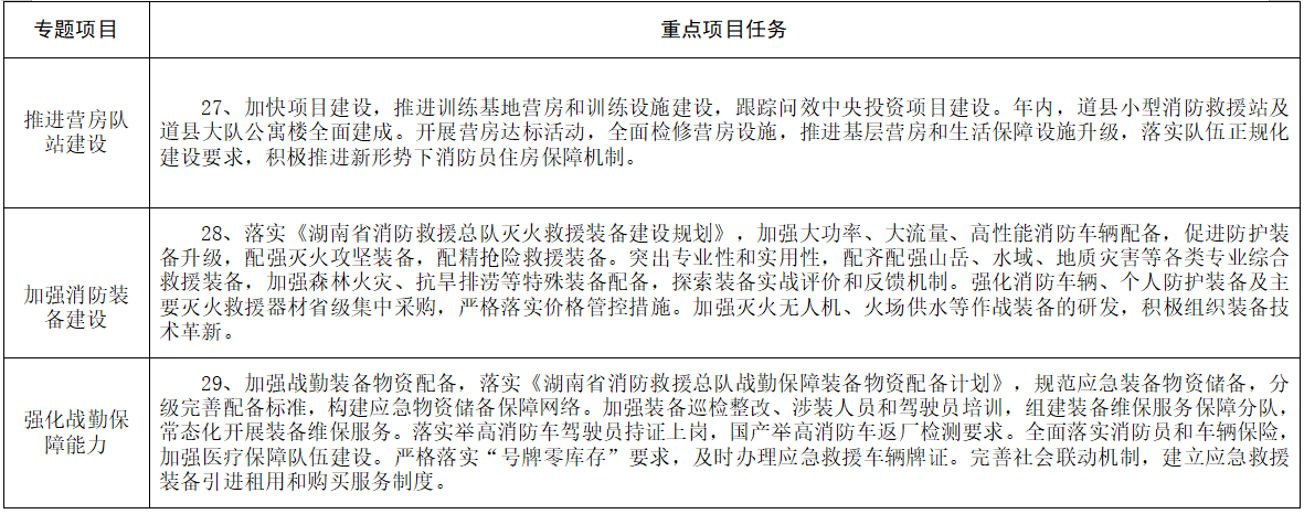 13、加强综合性消防救援队伍建设。要积极解决综合性消防救援队伍在转型升级方面遇到的困难问题,把政府专职消防员作为综合性消防救援队伍第二梯队力量建设,根据任务和形势需要,增加招录人数和经费保障。为适应“全灾种、大应急”的需要,突出专业性和实用性,为综合性消防救援队伍配齐山岳、水域、化危事故、地质灾害等专业综合救援装备,加强森林火灾、抗旱排涝、战勤保障等特殊装备配备,加快基础训练设施建设。加强信息化建设,提高应急处置工作效能,要强化应急救援指挥中心建设,集中调度指挥,对各类应急事故处置进行统一部署、统一指挥、统一调度。