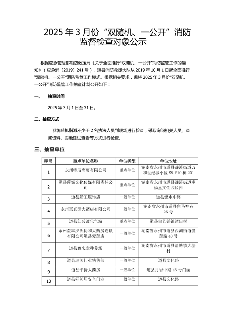 2025年3月份“双随机、一公开”消防监督检查对象公示