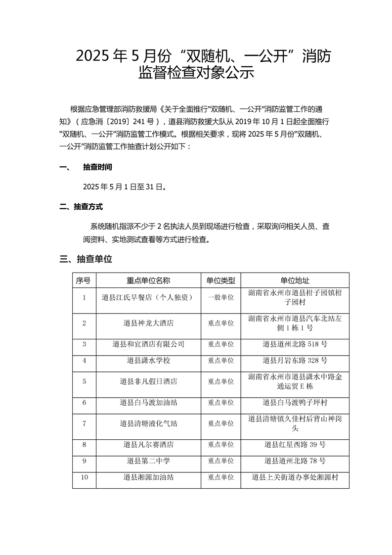 2025年5月份“双随机、一公开”消防监督检查对象公示