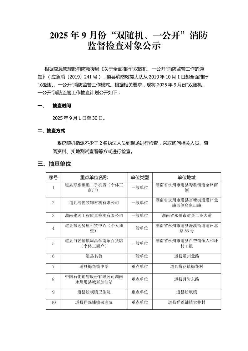 2025年9月份“双随机、一公开”消防监督检查对象公示