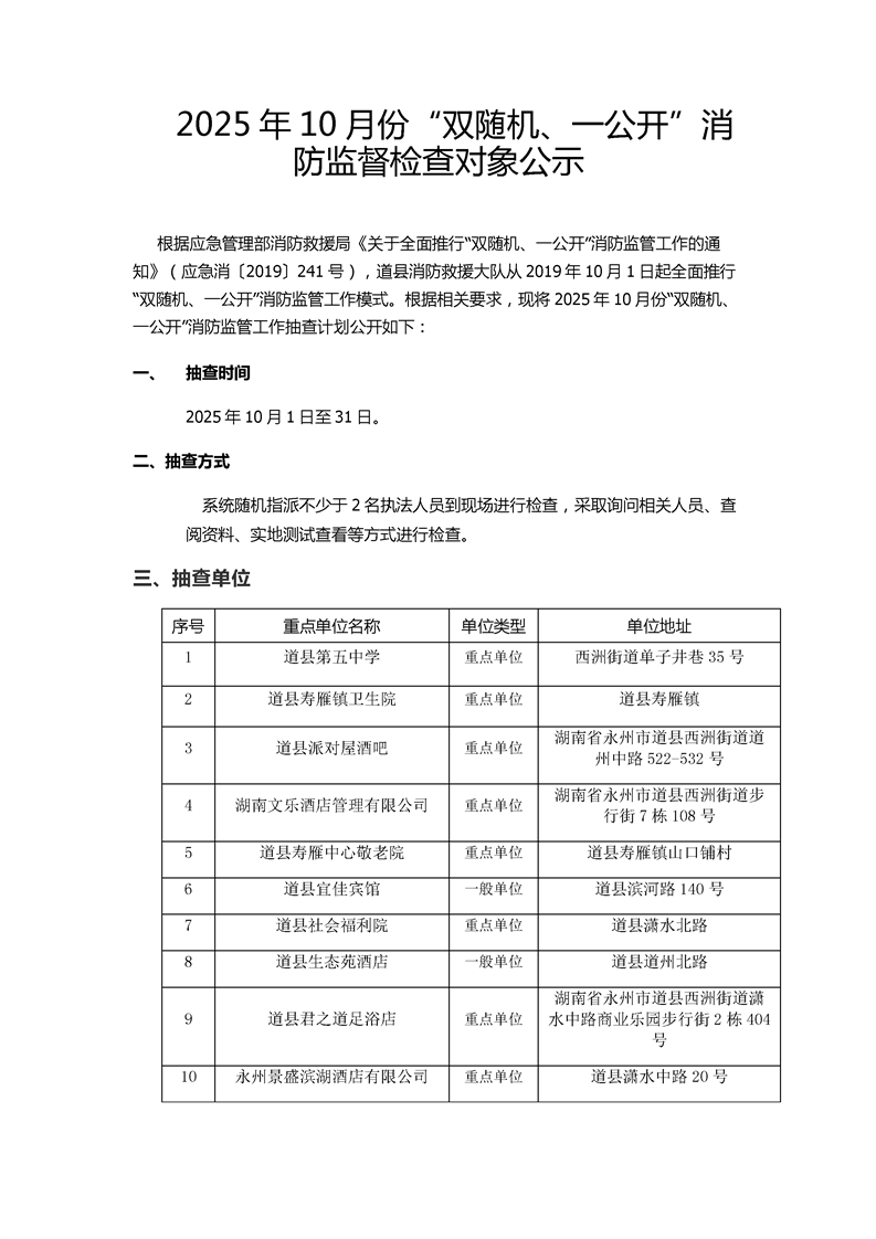 2025年10月份“双随机、一公开”消防监督检查对象公示