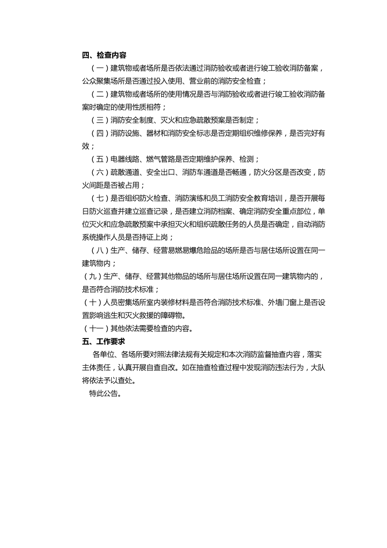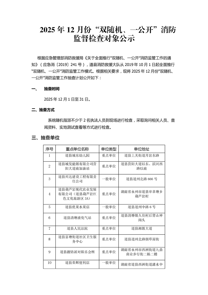 2025年12月份“双随机、一公开”消防监督检查对象公示
