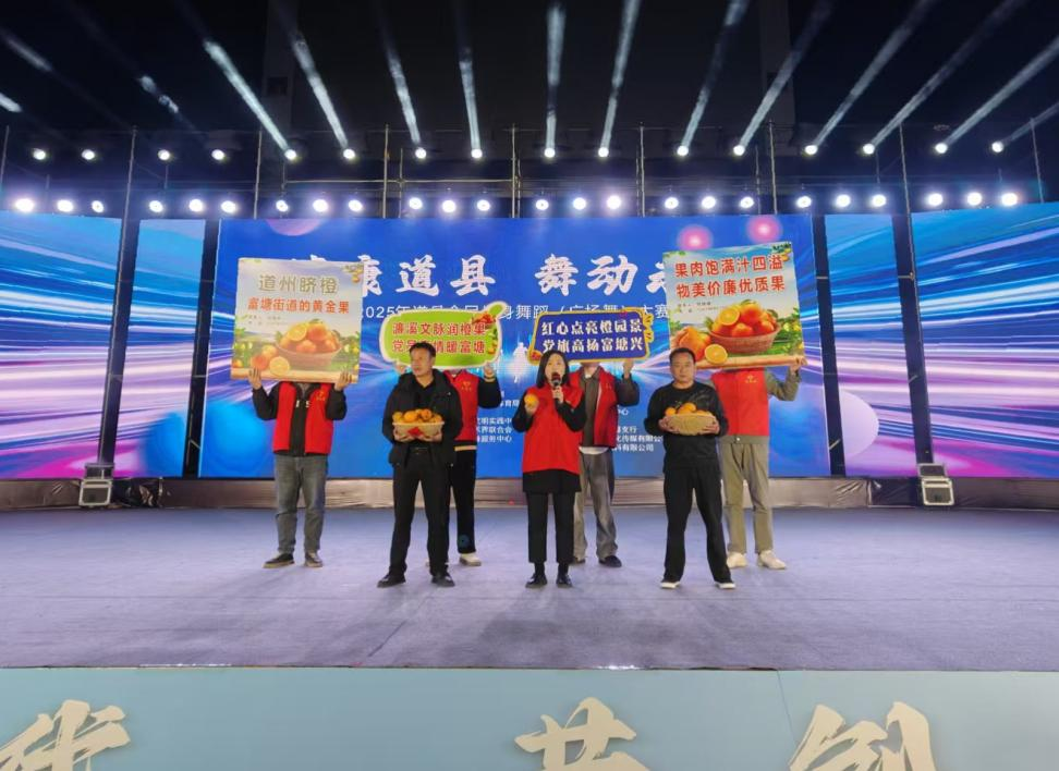 “各位领导、参赛队员、父老乡亲们,赏舞之前,先向大家推荐富塘街道的‘甜蜜成果’——道州脐橙!”张娟主任以热情话术开篇,迅速聚焦全场目光。她介绍,富塘街道依托优越自然禀赋,秉持生态种植理念,施用农家有机肥培育道州脐橙,该品种色泽金黄、皮薄易剥、果肉饱满,甜酸适口且橙香醇厚,是当季营养健康的优质果品。通俗鲜活的讲解,让赛事舞台变身特色农产品“公益直播间”,有效传递富塘脐橙品质优势。