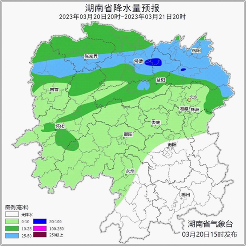 2020时至2120湘北阴天有中等阵雨或雷阵雨其中湘西州北部、张家界南部、常德中部、益阳北部、岳阳、长沙东部部分地区大到暴雨衡阳南部、株洲中南部、郴州、永州中南部多云到阴天其他地区阴天有阵雨或雷阵雨;北风23雷雨时局地阵风7最高气温湘南2527℃湘西、湘北1315℃其他地区1517℃最低气温湘南1517℃其他地区911℃