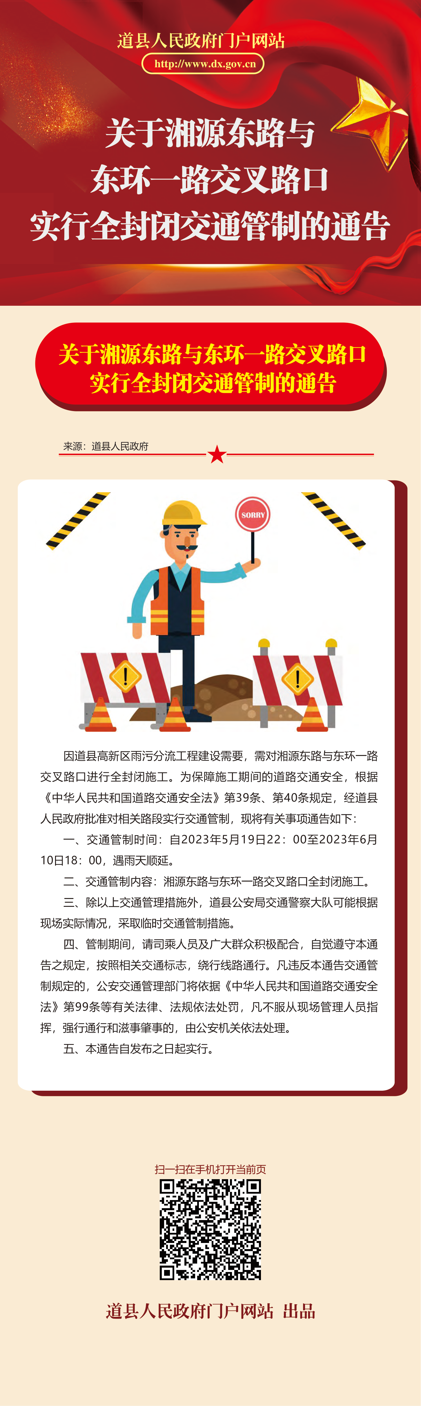 关于湘源东路与东环一路交叉路口实行全封闭交通管制的通告