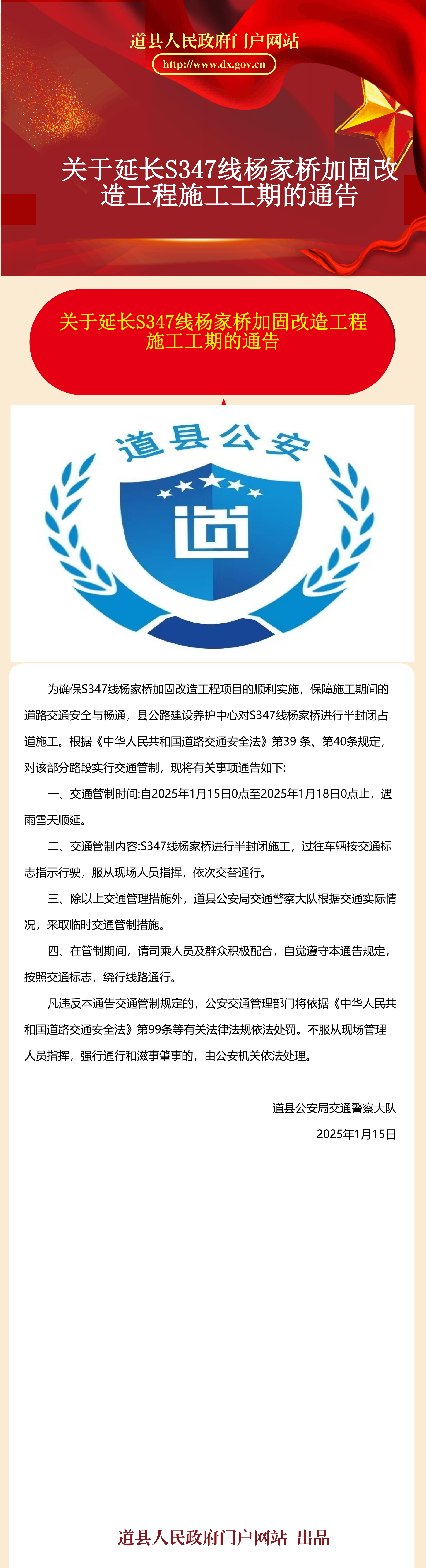关于延长S347线杨家桥加固改造工程施工工期的通告
