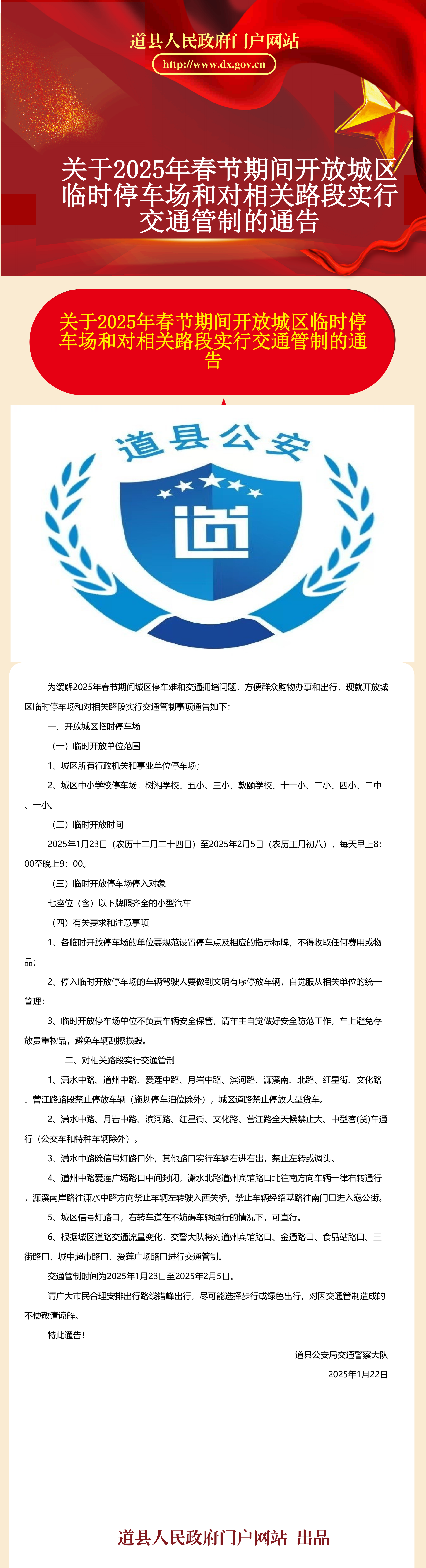关于2025年春节期间开放城区临时停车场和对相关路段实行交通管制的通告