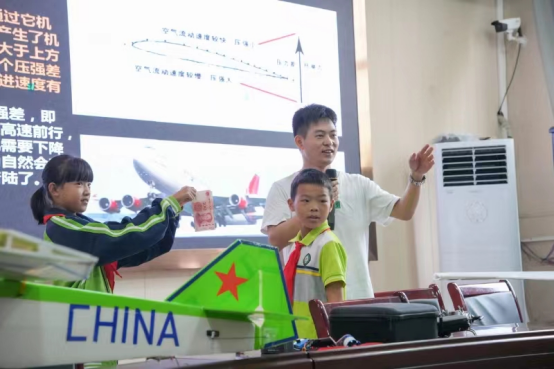 在学校的操场上, 李文涛老师为同学们带来了一场精彩的航模飞行表演。一架小巧的航模腾空而起,做着倒飞、侧飞、翻滚、急转、垂降等精彩的动作,学生们情不自禁地发出阵阵欢呼声,并纷纷上前询问航空模型飞空的原理和操作的技巧。在李老师的带领下,同学们亲手触摸着飞机模型,感受着它的精巧设计;参与简单的实验,体验着科学的奇妙之处,在这个过程中,他们不仅学到了知识,更培养了动手能力和创新思维。